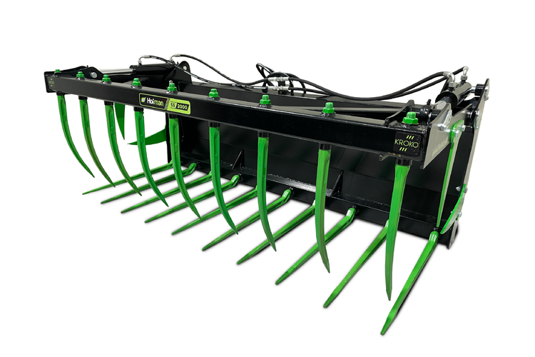 The HOFMAN KROKO SS grapple fork is a powerful and reliable tool for handling a wide range of loose materials such as silage, manure, branches, or bedding. It is designed for professional use in agriculture, municipal services, and forestry, where a strong and secure grip is essential. The fork is equipped with longer tines, specifically intended for handling voluminous or lightweight materials such as bedding or fresh silage. Both models are characterized by a robust construction made of high-quality steel, a reliable hydraulic gripping system, and the option to customize the type of hitch according to the tractor or loader used.