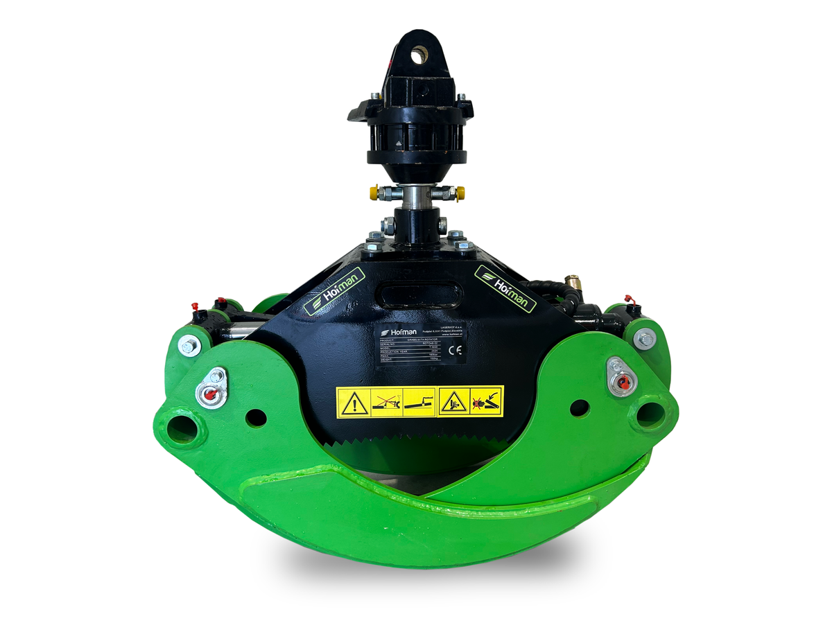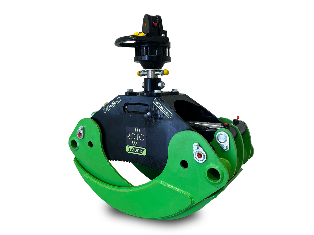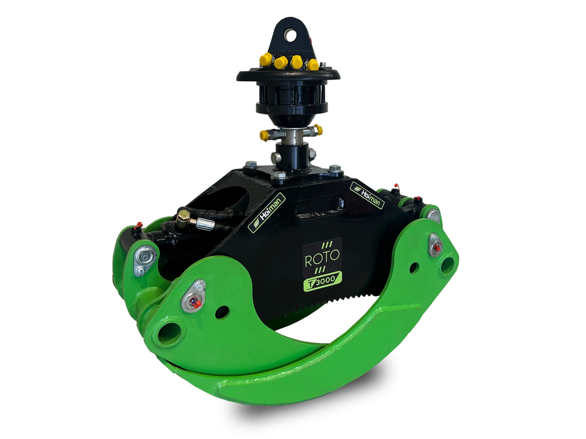 The HOFMAN ROTO T3000 grapple with rotator is a reliable tool for efficient forestry work. It features a robust construction, anti-corrosion protection, and 360° rotation powered by a strong hydraulic rotator. With its wide opening range, it is suitable for handling various types of logs. The grapple ensures safe, precise, and stable operation even in demanding conditions. An ideal choice for professional forestry use in combination with HOFMAN machinery.