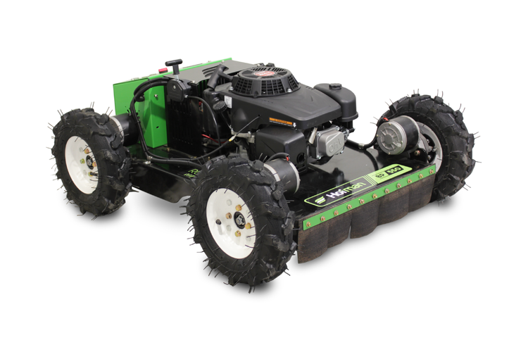 Hofman Ruby is a new-generation petrol robotic lawn mower operated via remote control. It provides the user with full control of the mowing process, even on hard-to-reach or potentially dangerous terrain. It is available in two working widths, 550 mm and 1000 mm, making it suitable for both small and large areas. The mower is powered by a reliable and powerful Loncin engine, ensuring consistent performance and high efficiency. One of its key advantages is the exceptional ability to adjust the cutting height, allowing precise adaptation to terrain type and vegetation density. It easily handles tall, overgrown and dense grass. Thanks to its chassis and drive design, it is suitable for use on both flat surfaces and slopes to 45 degrees, depending on the model. The BP1000 model is also suitable for professional users, municipal services, and demanding private users looking for a powerful, reliable, and easy-to-use solution for efficient mowing.