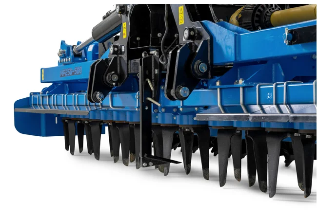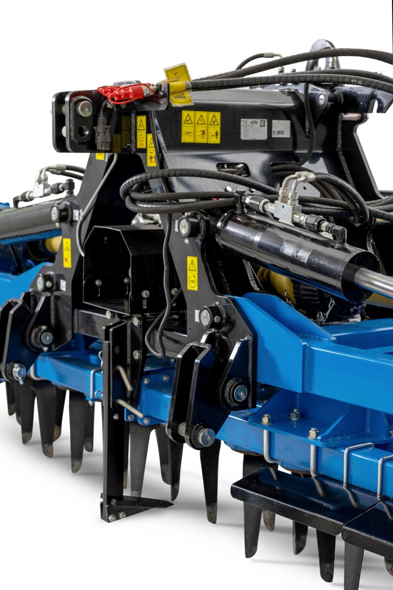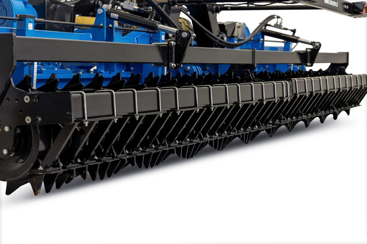 Behind the harrow, there is a hydraulically adjustable solid packer roller (diameter 50 cm), which further breaks up soil clumps, levels, and consolidates the seedbed, making it optimally prepared for sowing.